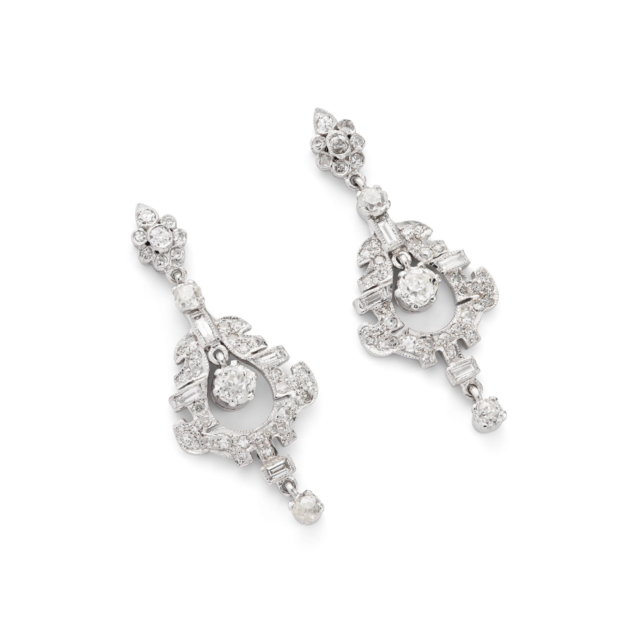 Each of pierced and shaped outline, set throughout with graduated round brilliant, baguette and eight-cut diamonds, post and butterfly fittings, stamped 750