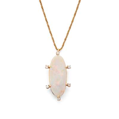 Claw-set with a large oval cabochon opal, in a border of six round brilliant-cut diamonds, UK hallmark; to a rope-twist chain, stamped 750