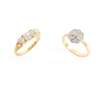 Claw-set with three cushion-cut diamonds, diamond chip detail, plain band, stamped 750; together with a diamond cluster ring, plain band, stamped 18ct (2)