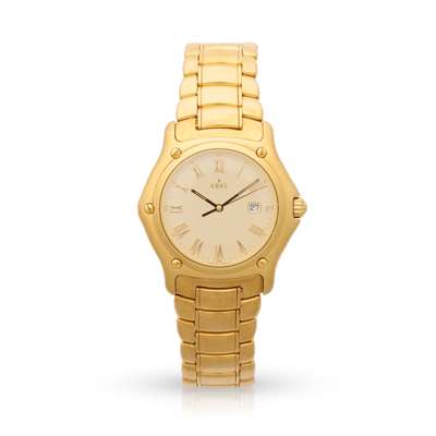 Quartz movement, cream coloured dial, applied gold Roman numerals, outer tritium dots, date aperture, luminous baton hands, centre seconds, tonneau shape 18k gold case with reverse secured screws, bezel secured by 5 screws, on fitted Ebel 18k yellow gold bracelet with folding clasp. Case, dial and movement signed