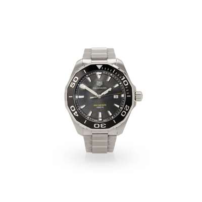 Quartz movement, round black dial with applied stainless steel lume-filled hour markers, date aperture at 3, outer seconds track in white, luminescent hands, stainless steel case with unidirectional black calibrated bezel, on a stainless steel bracelet strap with signed TAG Heuer foldover clasp