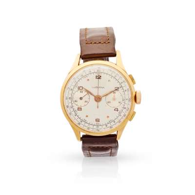 Mechanical movement, silvered dial with alternate numerals and dots, outer base 1000 scale, subsidiary dials for running seconds and 30 minute chronograph register, gilt leaf hands, circular case. Dial signed, case numbered