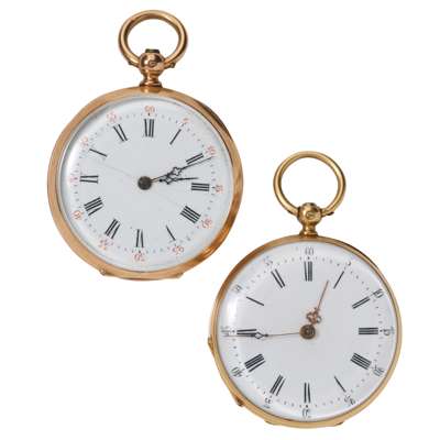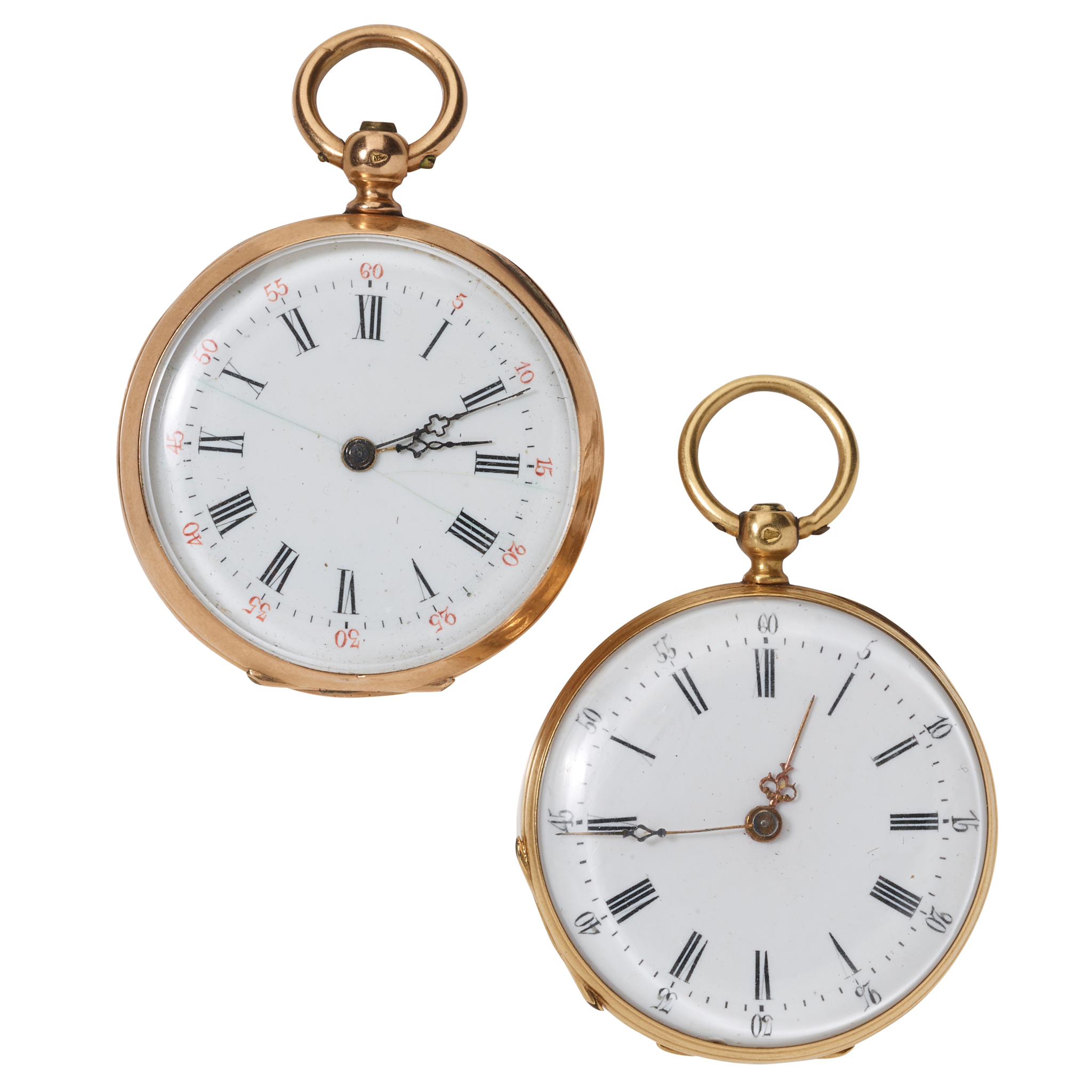 Both open face with enamel dials and cylinder escapements, one with metal cuvette, unsigned