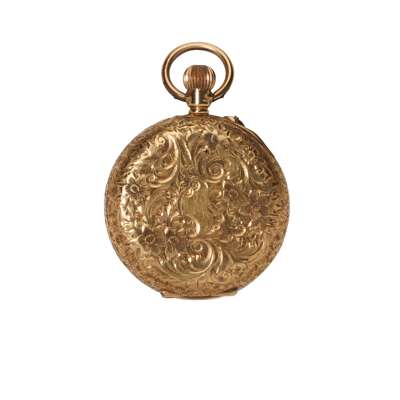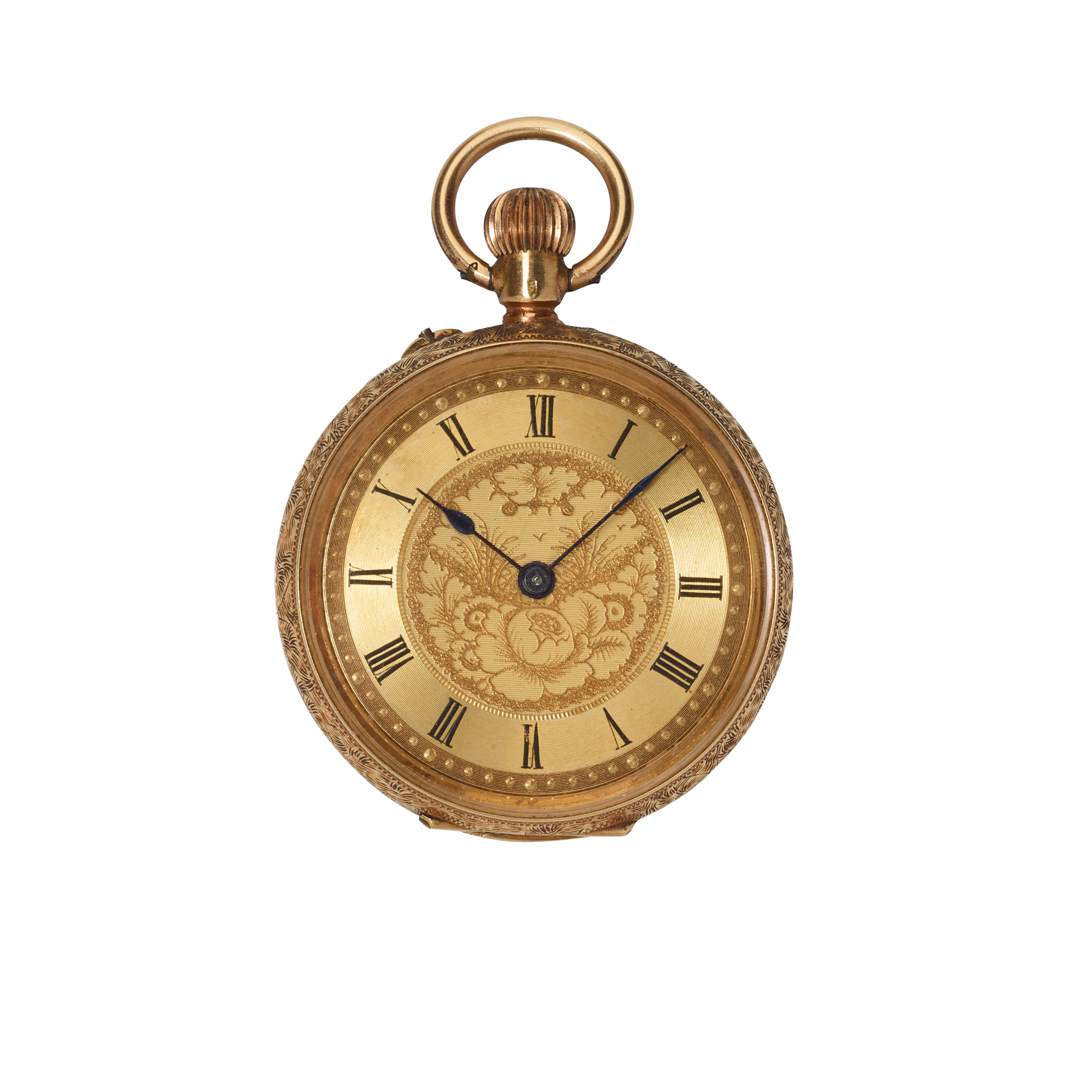 Lever escapement, gilt dial with central decoration, foliate & foliage decorated 18k gold hinged case with plain cuvette, numbered case.