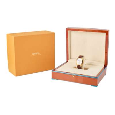 Cal.E139 self-winding 27 jewel movement, silvered dial with central pattern, applied gold index markers, apertures for minutes, hours disc and date, leaf hands, centre seconds, tonneau shape case with exhibition reverse, strap secured by screws, with 18k gold Ebel deployant buckle, case, dial and movement signed. Accompanied by presentation case and blank Ebel warranty