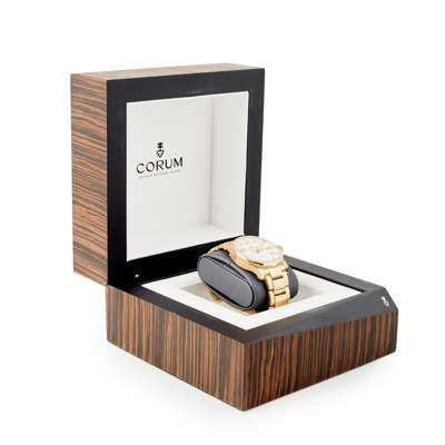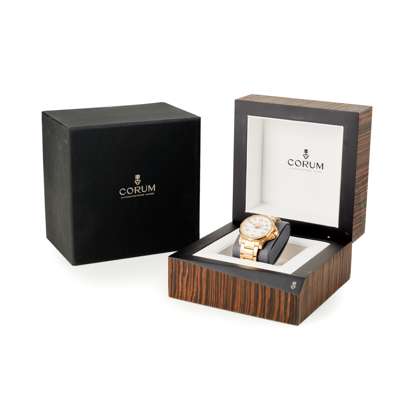 Automatic movement, white dial with applied rose gold alternate numerals and chevrons, outer 24 hours, raised outer minutes and hours indicated by sailing flags, luminous index hands, 24 hour hand, date aperture, dodecagon bezel, screwed-down numbered reverse, on fitted 18k rose gold Corum bracelet. Case, dial and movement signed. Accompanied by a Corum presentation box, booklet, wallet and numbered warranty dated 26/3/2013