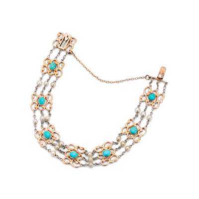 Each scrolling link collet-set with a cabochon turquoise, joined by trace links set with a seed pearl, stamped 15