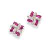 Each channel-set with rows of baguette-cut rubies and small round brilliant-cut diamond detail, post and clip fittings, stamped 750