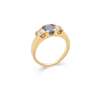 Claw-set with an oval-cut sapphire and two round brilliant-cut diamonds, plain band, stamped 750
