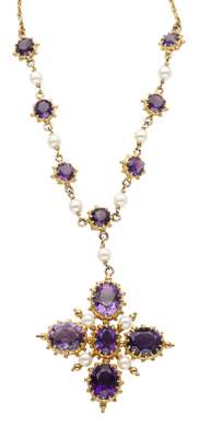 A 9ct gold amethyst and pearl pendant necklace