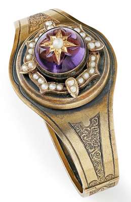 A pinchbeck amethyst and pearl set bangle