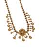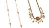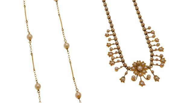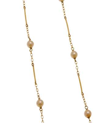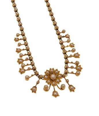 of fringed floral design, set throughout with graduated seed pearls, with flattened circular links and a pearl set box clasp; together with a yellow metal fancy link necklace set at intervals with cultured pearls (2)