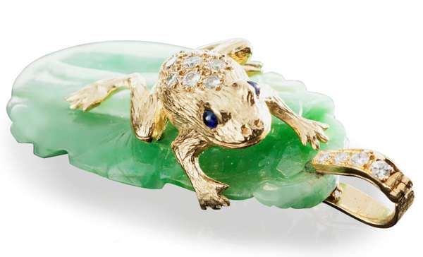 the jade modelled as a leaf, with applied yellow metal detail of a frog, the textured ground set throughout with small round cut diamonds and two small cabochon sapphire eyes, the base similarly set with round cut diamonds