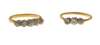 claw set with three graduated round cut diamonds, plain unmarked yellow metal shank; together with a five stone diamond ring claw set with five graduated round cut diamonds, plain yellow metal shank stamped 18CT PLAT (2)