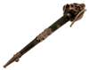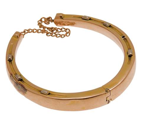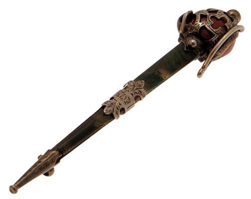 of hinged form with additional curb link chain, modelled in unmarked yellow metal; together with a Victorian silver and agate mounted kilt pin, modelled as a sword (2)