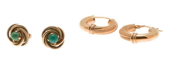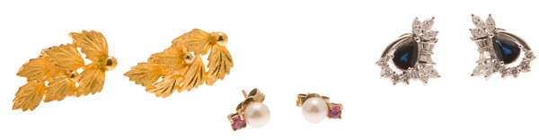set with a pear cut sapphire in a stylized surround of small marquise, round and baguette cut diamonds, set in unmarked white metal with post and butterfly fittings; together with a pair of pearl and ruby set studs; a pair of yellow metal foliate earrings; a pair of gilt metal hoop earrings; a pair of yellow metal and turquoise set studs (5)