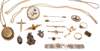 to include various pearl and gem set stick pins and bar brooches; a yellow metal and citrine set ring; a yellow metal mourning ring; an RAF sweetheart brooch with enamel detail, stamped 9ct; various silver pendants and brooches; a small seed pearl set mourning brooch; a hardstone set brooch with turquoise detail; two yellow metal chains stamped 750; and another, unmarked, with locket (qty)
