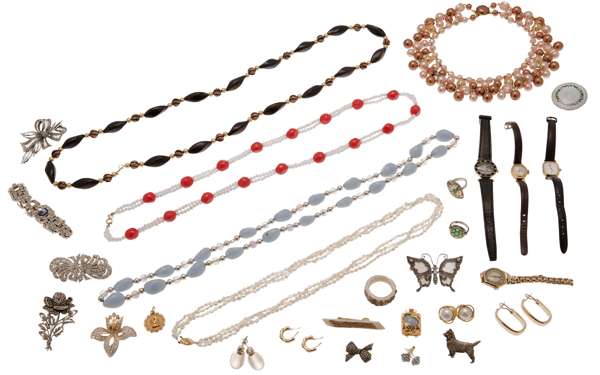 to include various yellow metal and paste set chains; a collection of beaded necklaces and faux pearls; several marcasite set brooches; a Swarovski floral brooch; a pair of white metal channel earrings in associated box; various other paste set earrings, brooches and other (qty)