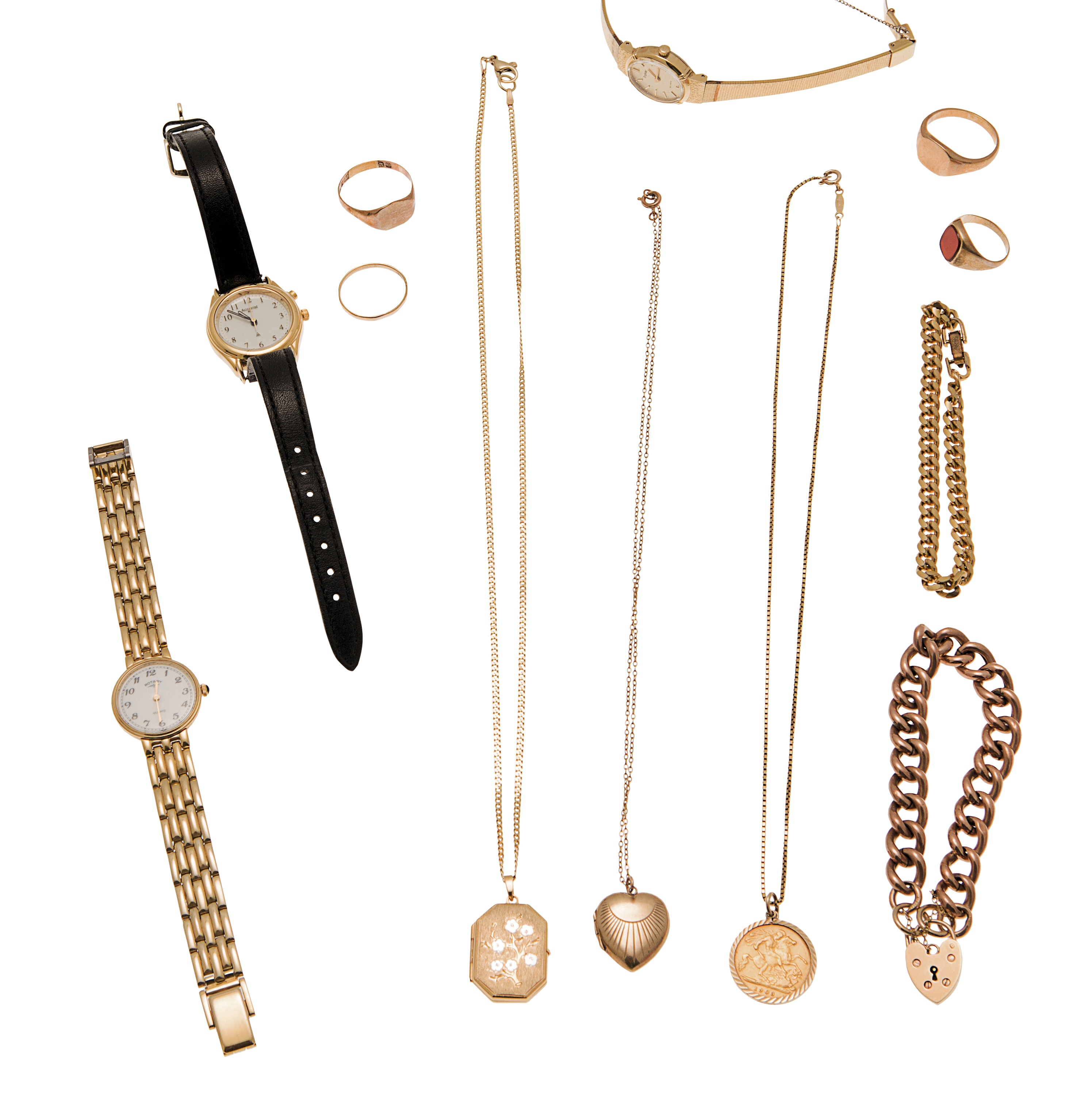 to include a gilt metal ladies Pulsar wrist watch; a gilt metal ladies Rotary wrist watch; a ladies Accurist wrist watch; three 9ct gold rings; a yellow metal gentleman's agate set signet ring; a 9ct gold curb link bracelet; another unmarked; a half sovereign set pendant and chain; a 9ct gold locket and chain and another, unmarked (qty)