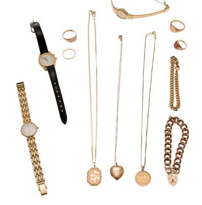 A collection of wrist watches and gold jewellery