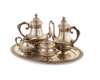 800 standard, comprising a tea and coffee pot, lidded sucrier, cream jug and matching oval tray, all decorated in classical manner, polished and satin ground, chased borders, clasped scroll handles and spout, demi ribbed body, engraved cartouches