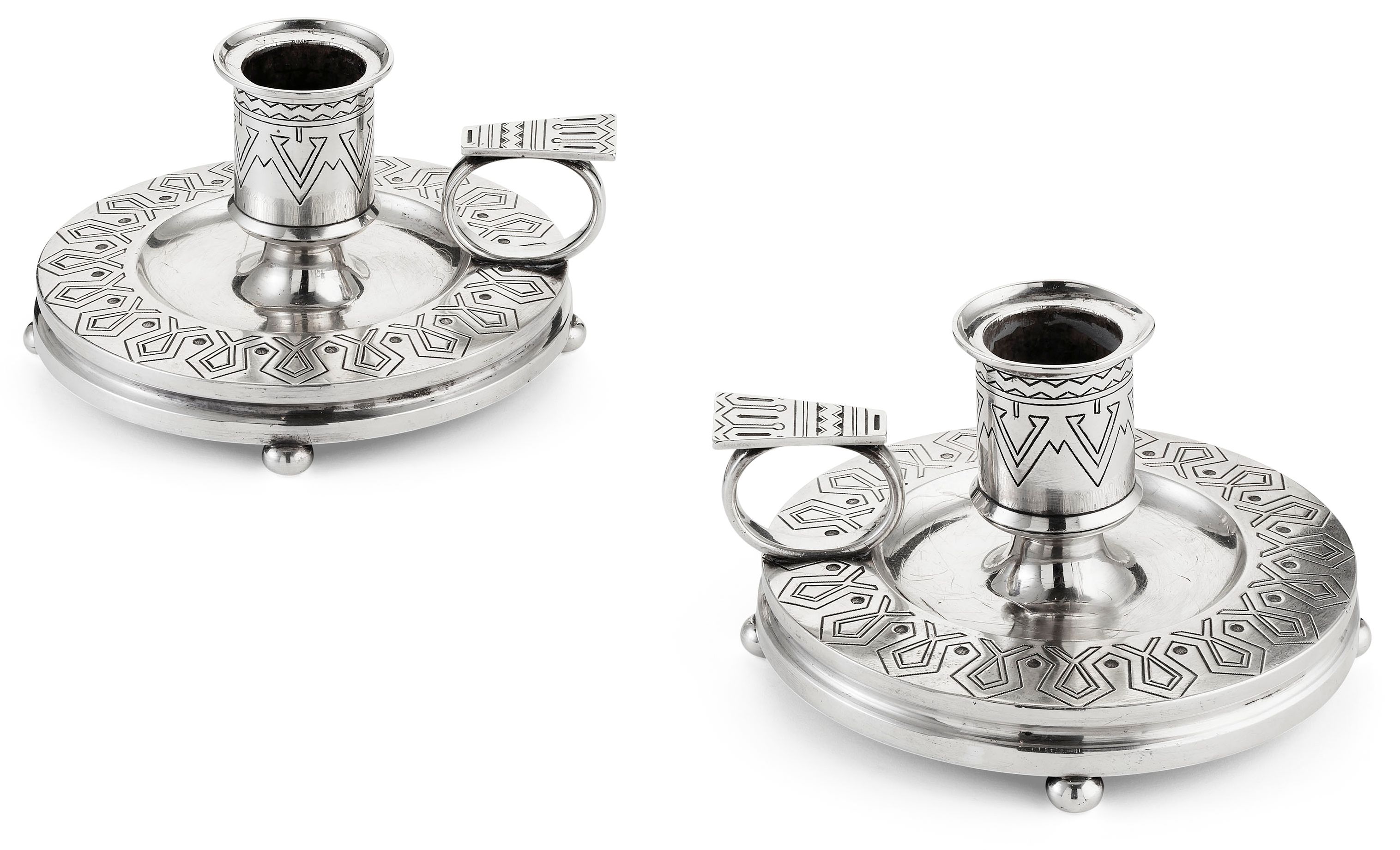 Pavel Sazikov, St Petersburg, 1870-1890, of circular form, geometric engraved border and sconce with similar detail to the tapering handle (2)