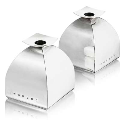 Graham Stewart, feature hallmarks, Glasgow, 2002, each of polished square rounded tapering form, simple flared sconce, plain hollow body, raised underside