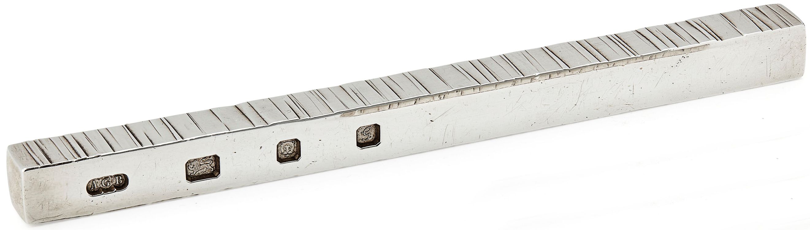 Gerald Benney, London 1970, modelled as a long bar, textured deeply to two sides, one polished side with feature hallmarks the other 'OAP 20'