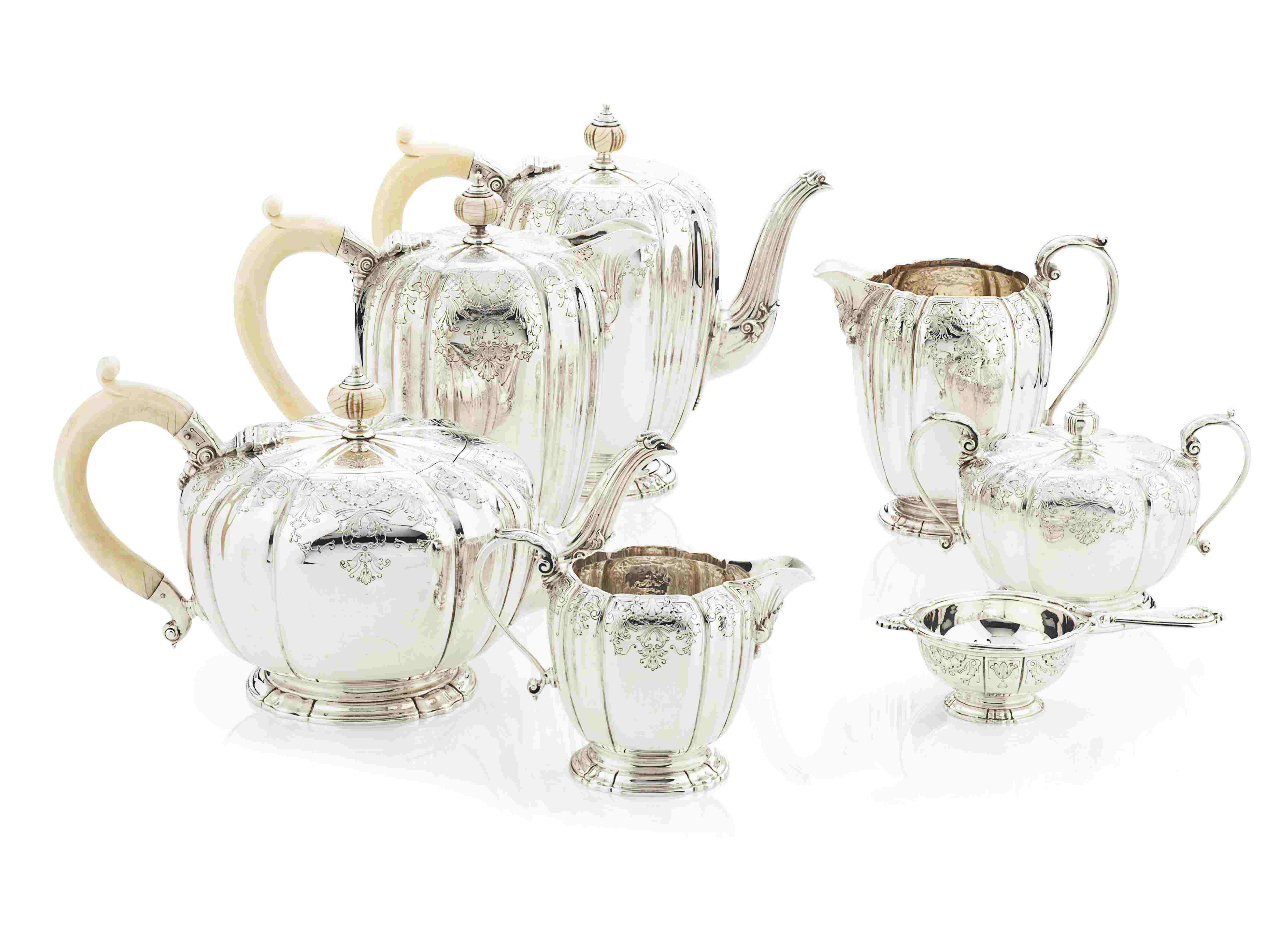 London 1959, comprising; a teapot, coffee pot, hot water jug, large and small milk jugs, a sucrier and cover, a tea strainer and stand, each piece of tall lobed form, well engraved decoration to the shoulders in the style of Paul de Lamerie, the pots with ivory scroll handles and finials