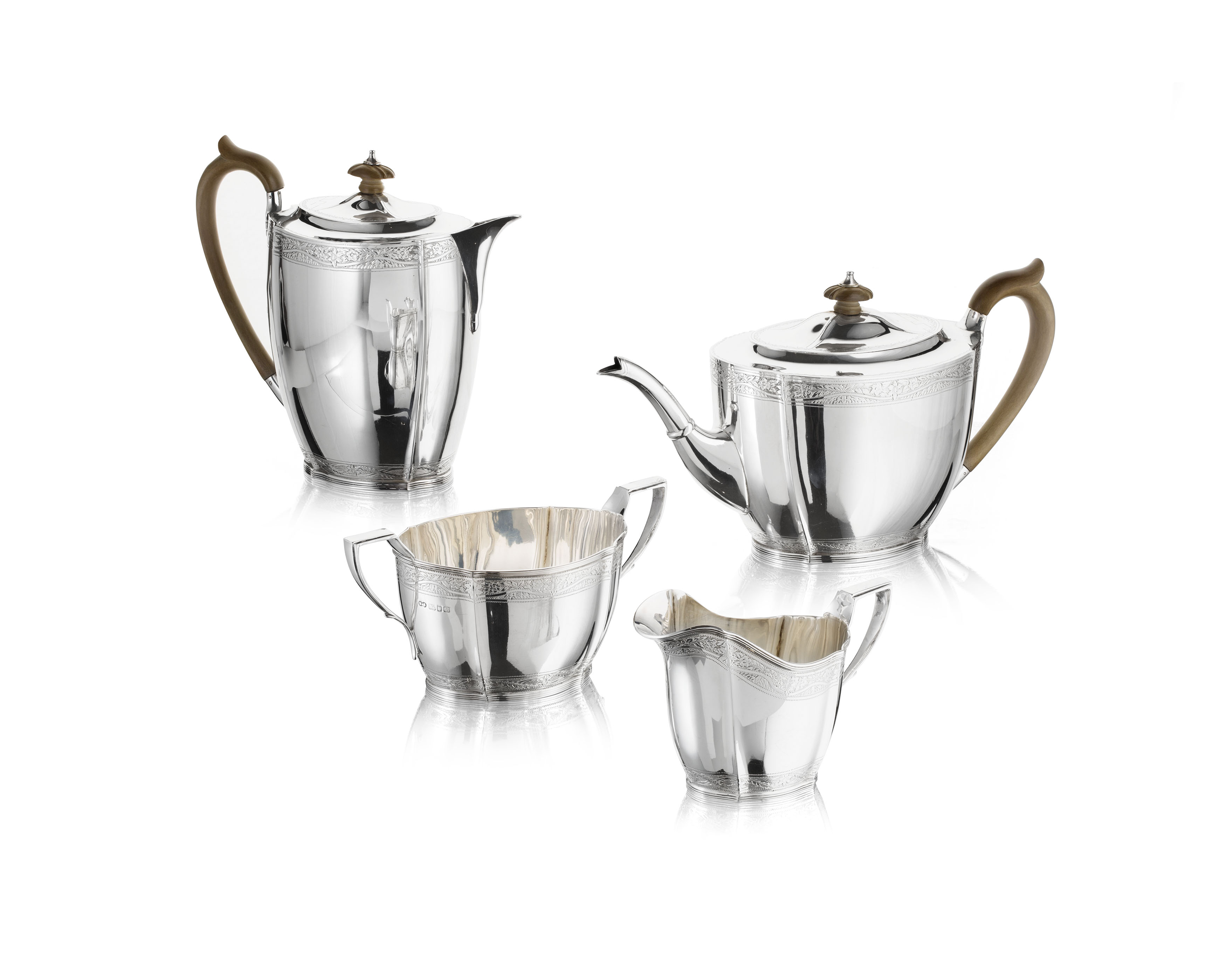Retailed by Wilson and Sharp, London 1947, of shaped oval form, bright cut engraved banded decoration comprising; a tea and water pot, sugar and cream