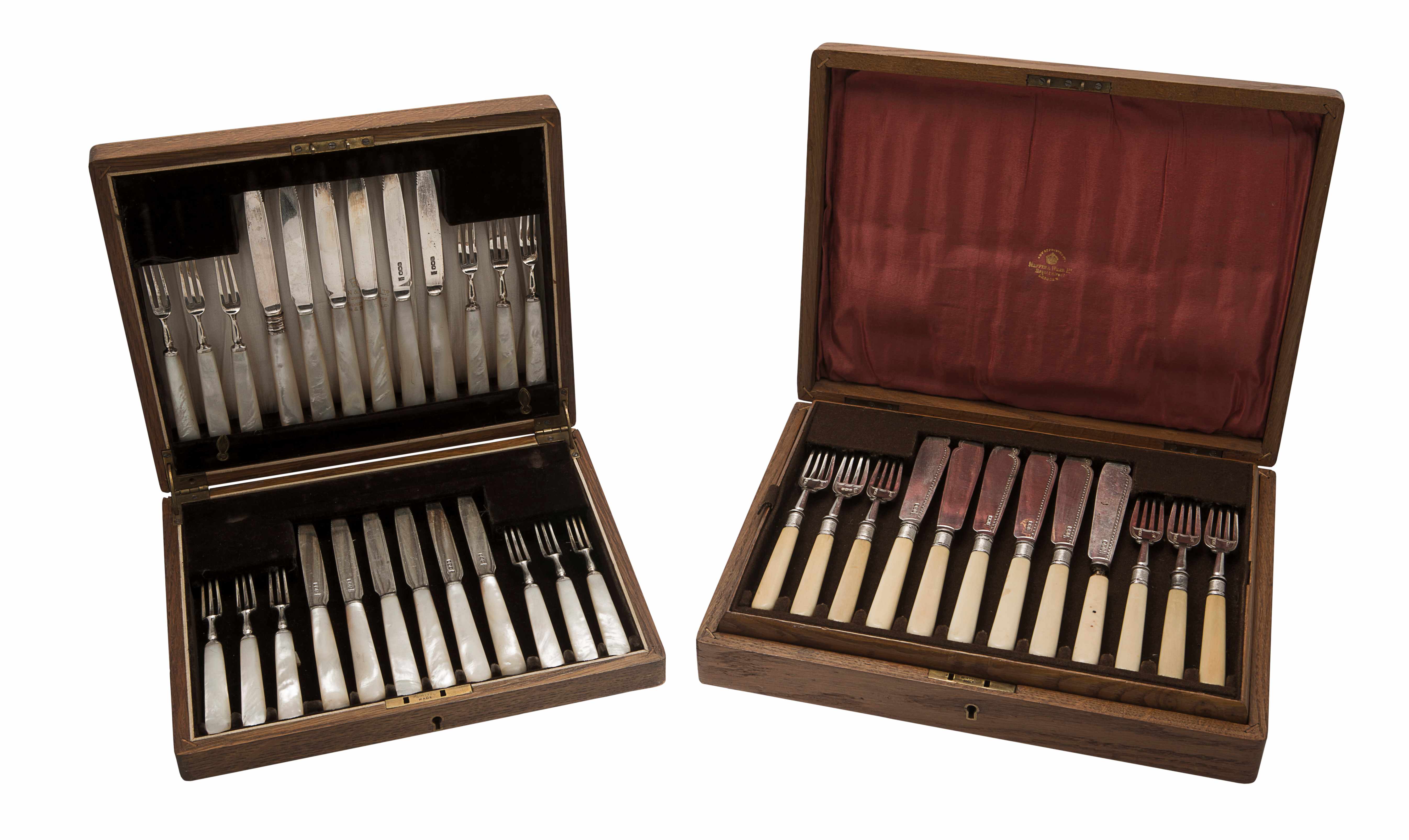 to include: silver bannock fork; pair Georgian later decorated berry spoons; twelve silver teaspoons and tongs; twelve silver small pastry forks;twelve mother of pearl handled fruit knives and forks, silver blades and tines; twelve fish knives and forks, silver blades and tines, last two sets in fitted oak cases (qty)