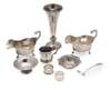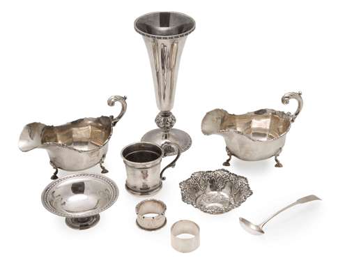to include; a pair of sauce boats, cast moulded rim, leaf clasped handle, scroll legs, hoof feet; a large spill vase, Elkington and Co., a bonbon dish; a christening mug; a small tazza; a Scottish Georgian sauce ladle; a napkin ring