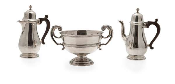 Mappin and Webb, Sheffield 1932, of plain baluster form, domed hinged covers, turned finials, pedestal foot; together with a twin handled rose bowl, James Dixon and Sons, Sheffield 1908, of plain form, ribbed body, leaf clasped scroll handle, pedestal foot