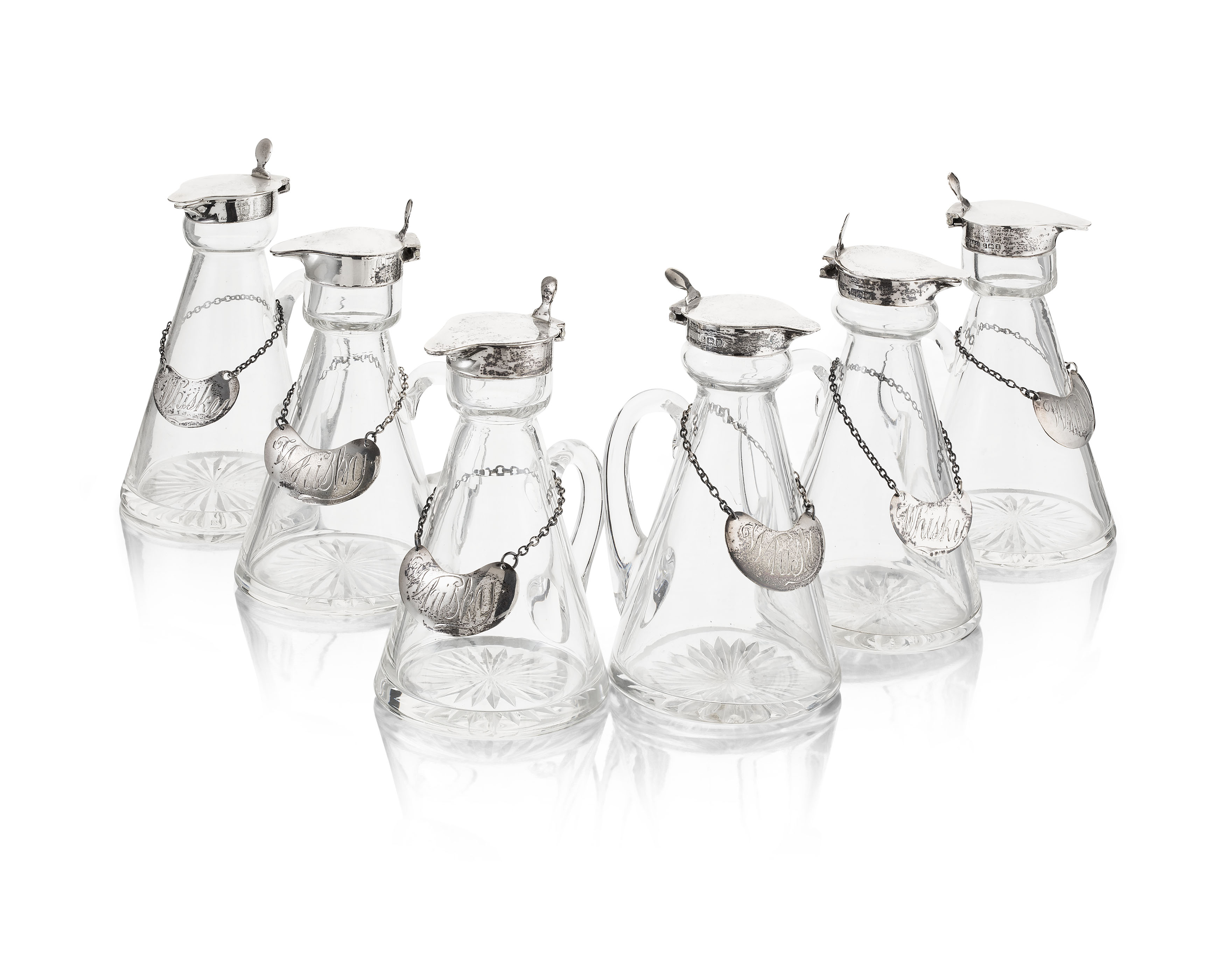 of traditional form, plain silver mounts, simple thumbpiece, star cut glass bodies, each with a whisky label, Hukin and Heath (12)