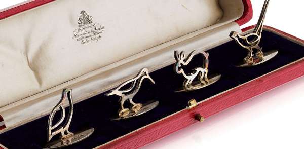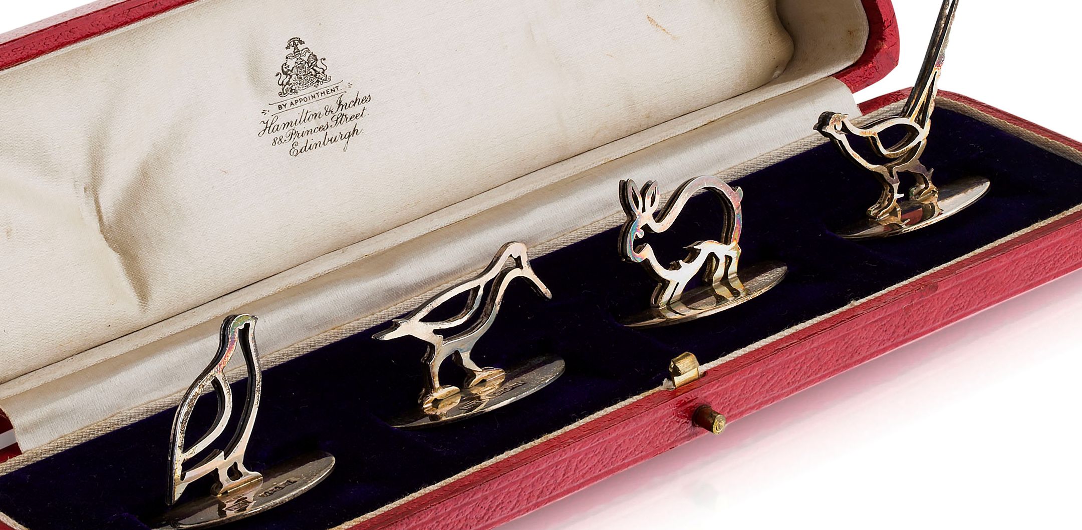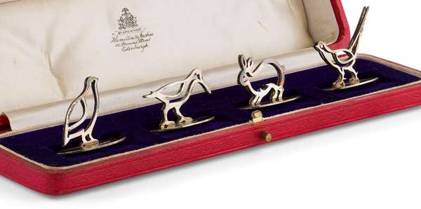Hamilton and Inches, Edinburgh 1927, skeleton frame forming game birds and a rabbit, each on an oval base, fitted Hamilton & Inches box