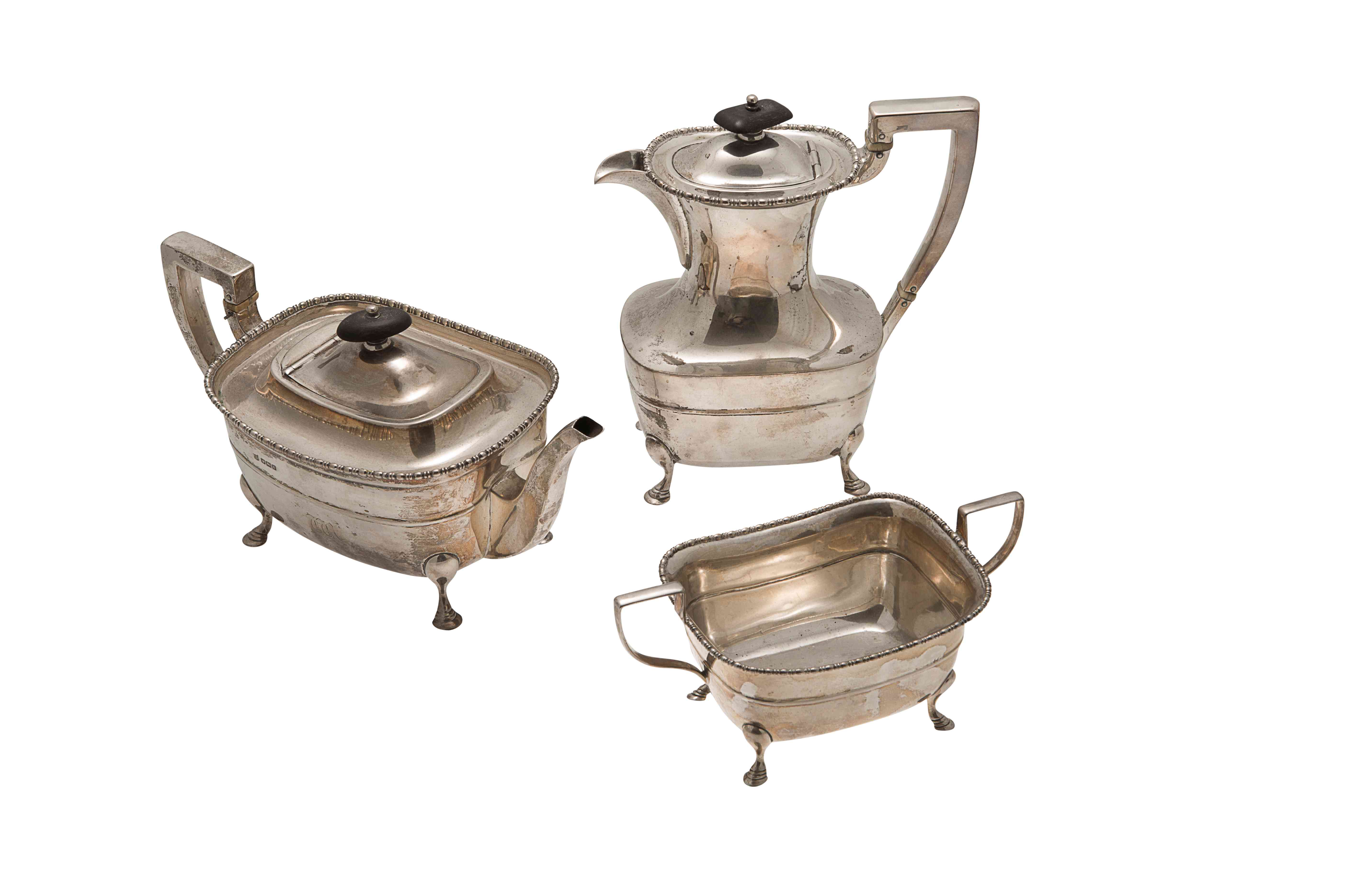 Fenton Brothers Sheffield, 1913, of rounded form, cast decorated border, angular handles, cabriole legs, hoof feet, comprising: a teapot, sugar and water pot (3)