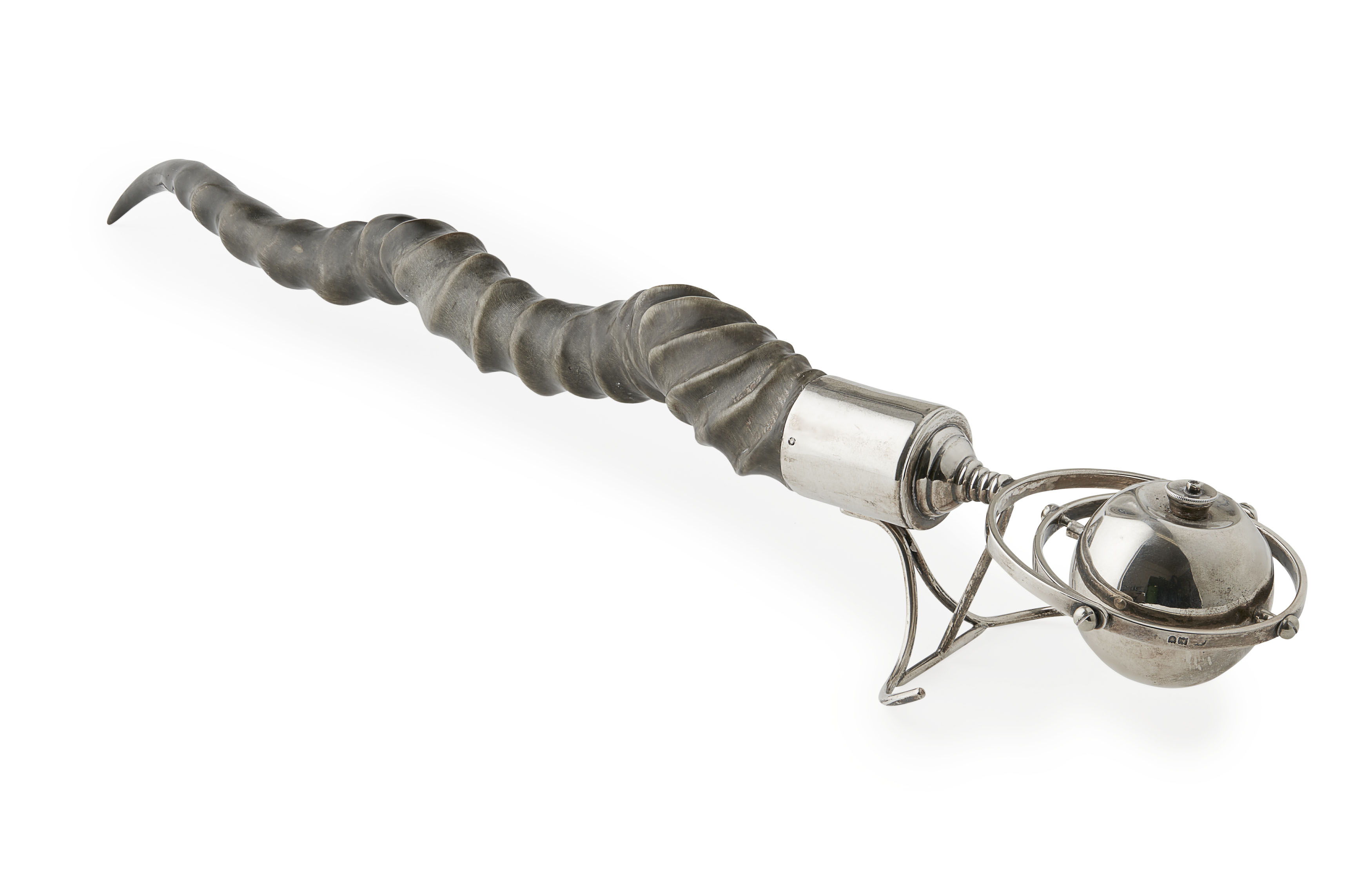 London circa 1900, curled antelope horn, silver collar at wide end with a stand and a gimbal mounted spherical shaped lighter
