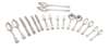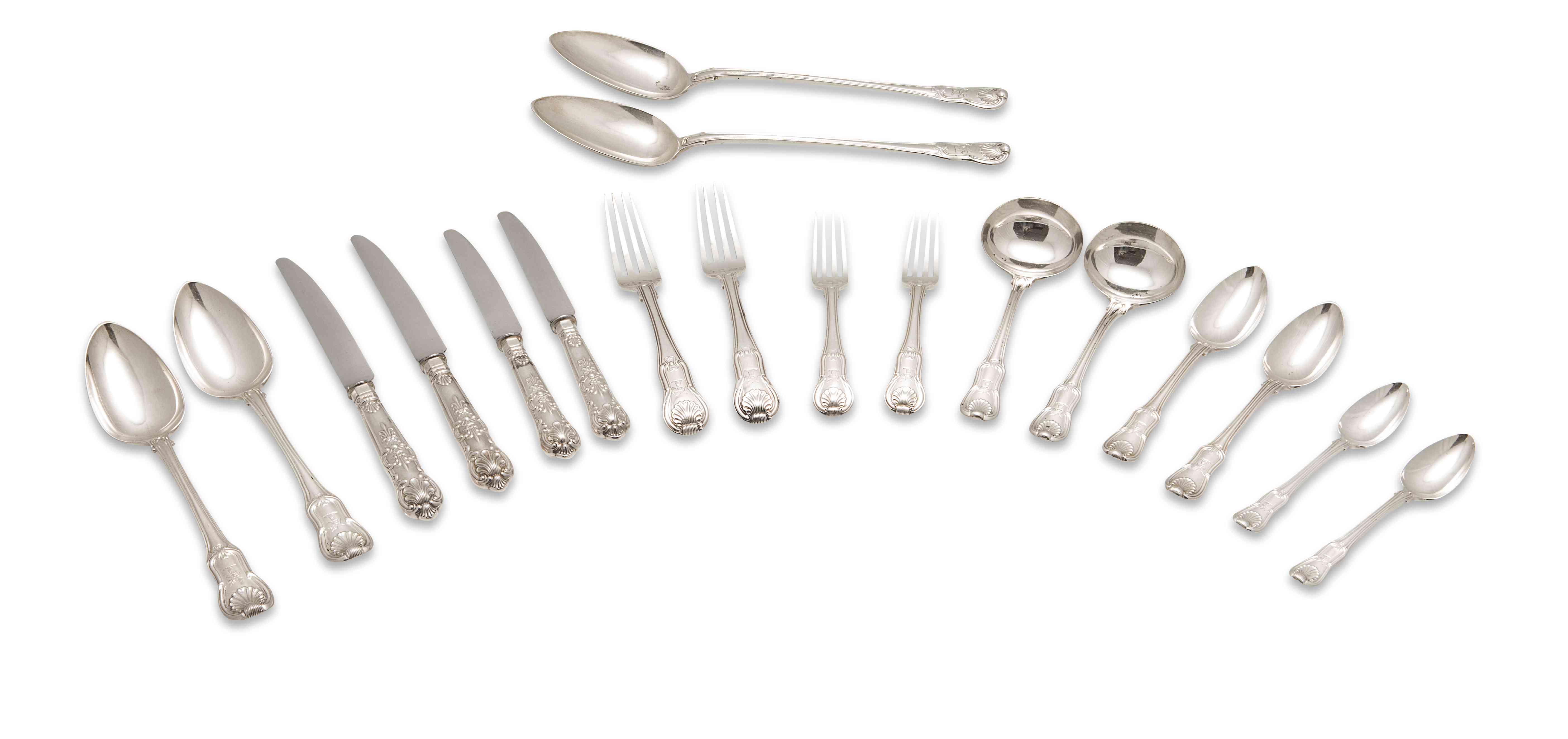 mainly London circa 1800, Queen's pattern, double struck, engraved crest, comprising: twelve each of, table and dessert forks, table and dessert spoons, teaspoons, two sauce ladles, twelve each of later silver handled steel bladed side and table knives