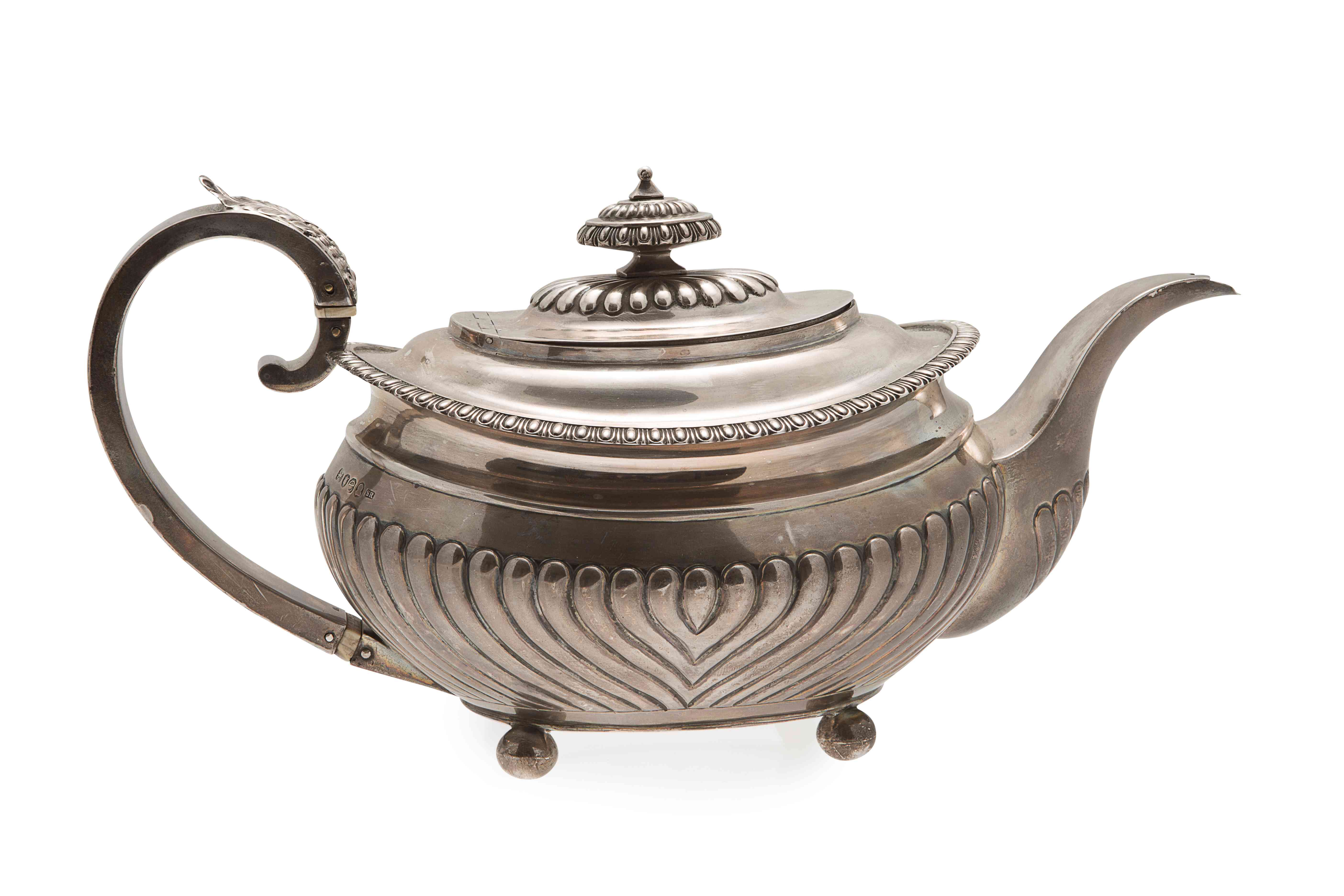 SR, London circa 1800, of rounded form, demi ribbed, raised on four ball feet, plain leaf clasped handle and spout
