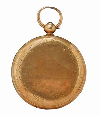 open faced, key wind, gilt dial, Roman numerals, the rear engraved with scene of Mount Vesuvius erupting, plain lever movement, signed