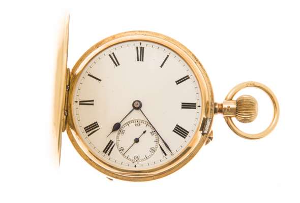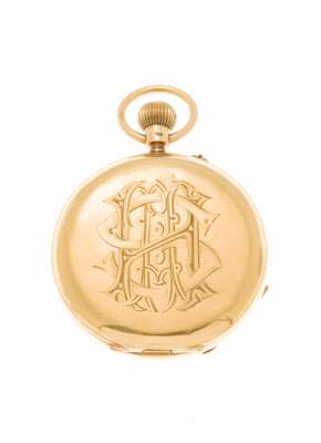 in full hunter case, engraved monogram, keyless wind, engraved cuvette, three quarter plate lever movement