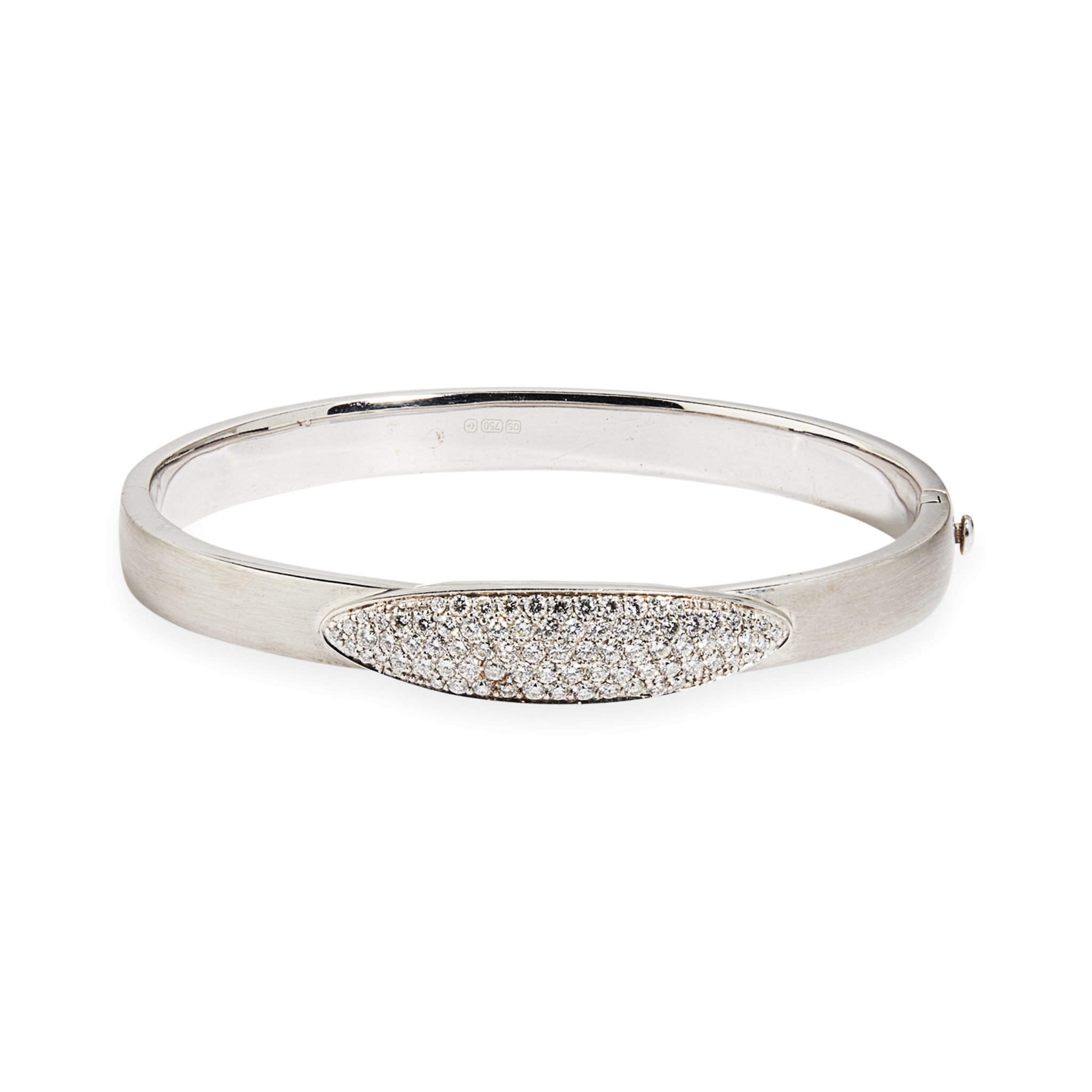 of hinged design, with applied pave set oval detail, to a plain satin finished bangle, with concealed clasp and safety clip
