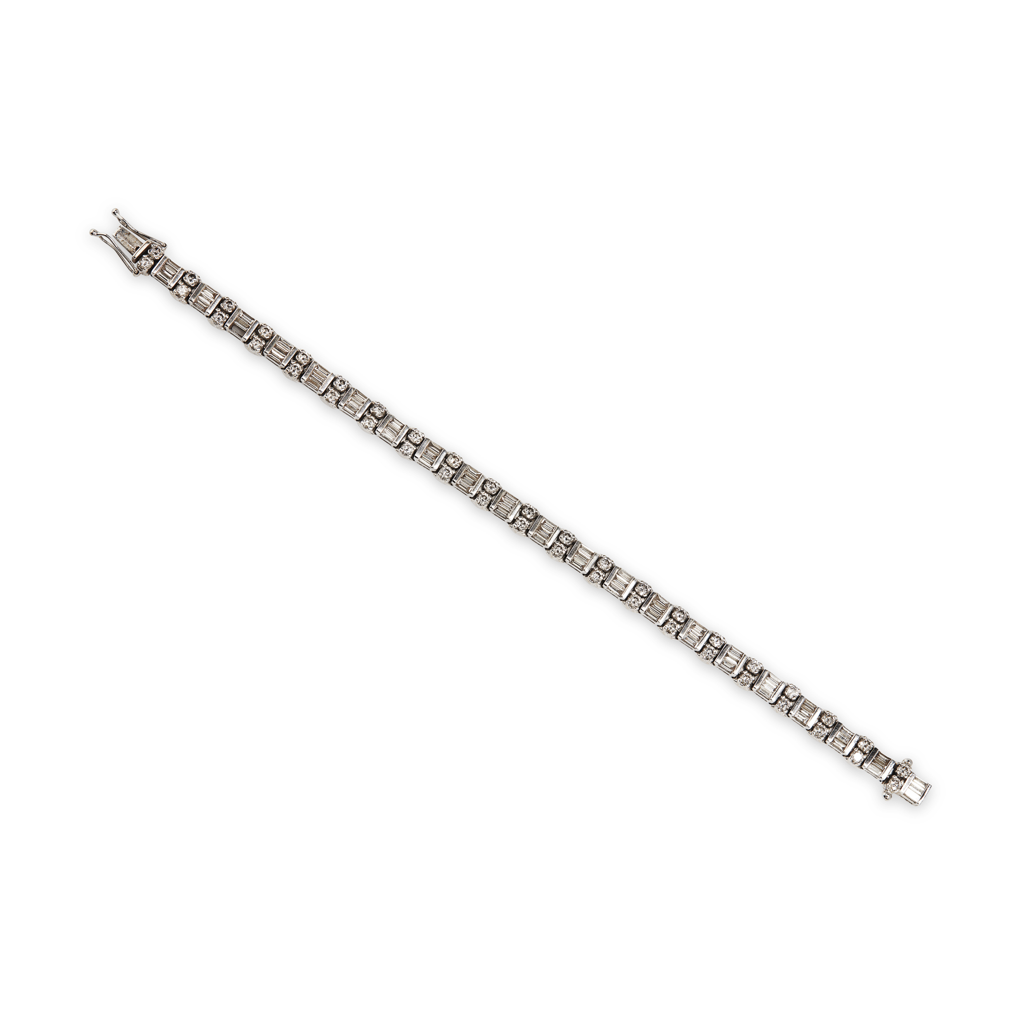 of articulated form, the links alternately set with pairs of small round cut diamonds and three channel set baguette cut diamonds, concealed clasp and safety clips