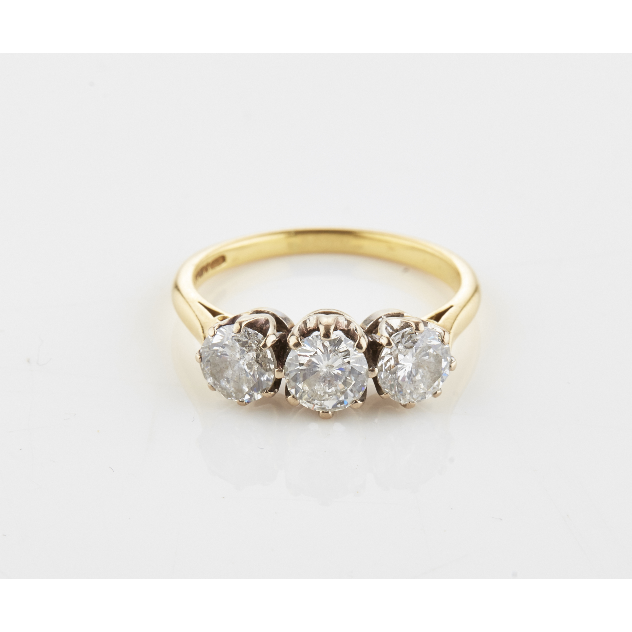 claw set with three slightly graduated round cut diamonds, to a plain 18ct gold shank
