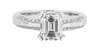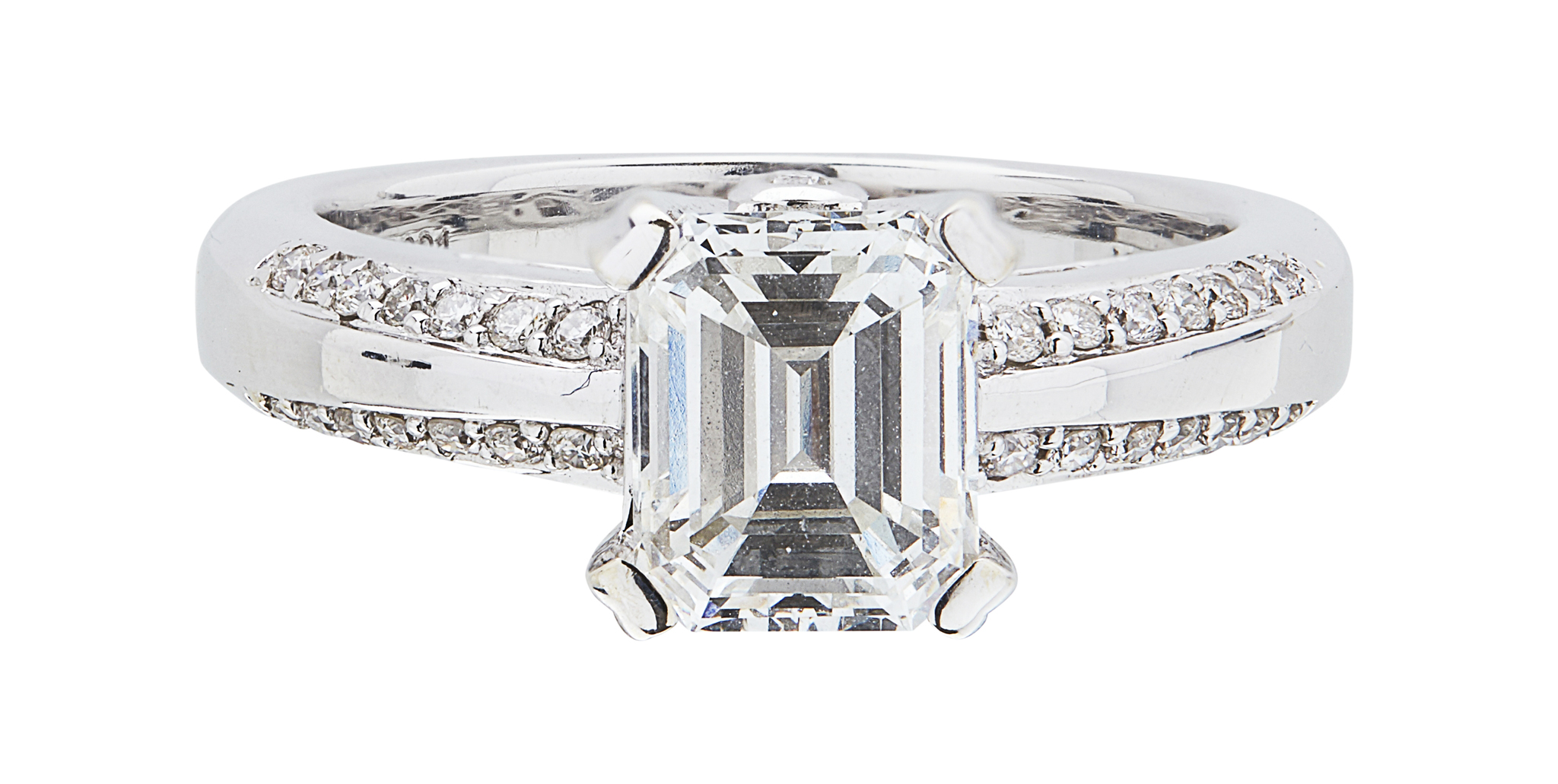 claw set with a trap cut diamond, the gallery collet set with two small round cut diamonds, the shoulders each set with two rows of graduated round cut diamonds, plain white metal shank