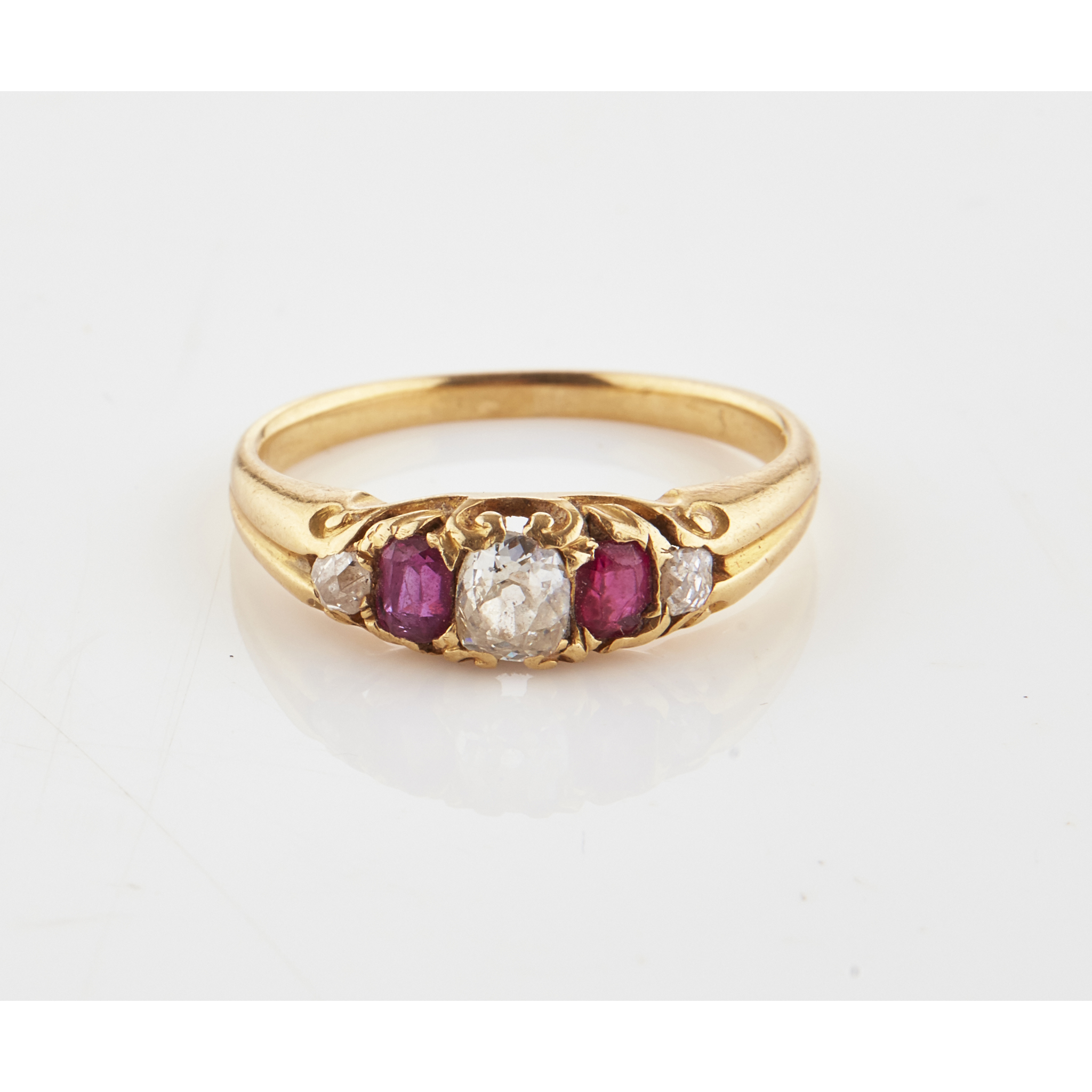 claw set two small oval cut rubies and three graduated old cut diamonds, to a plain yellow metal shank, unmarked