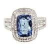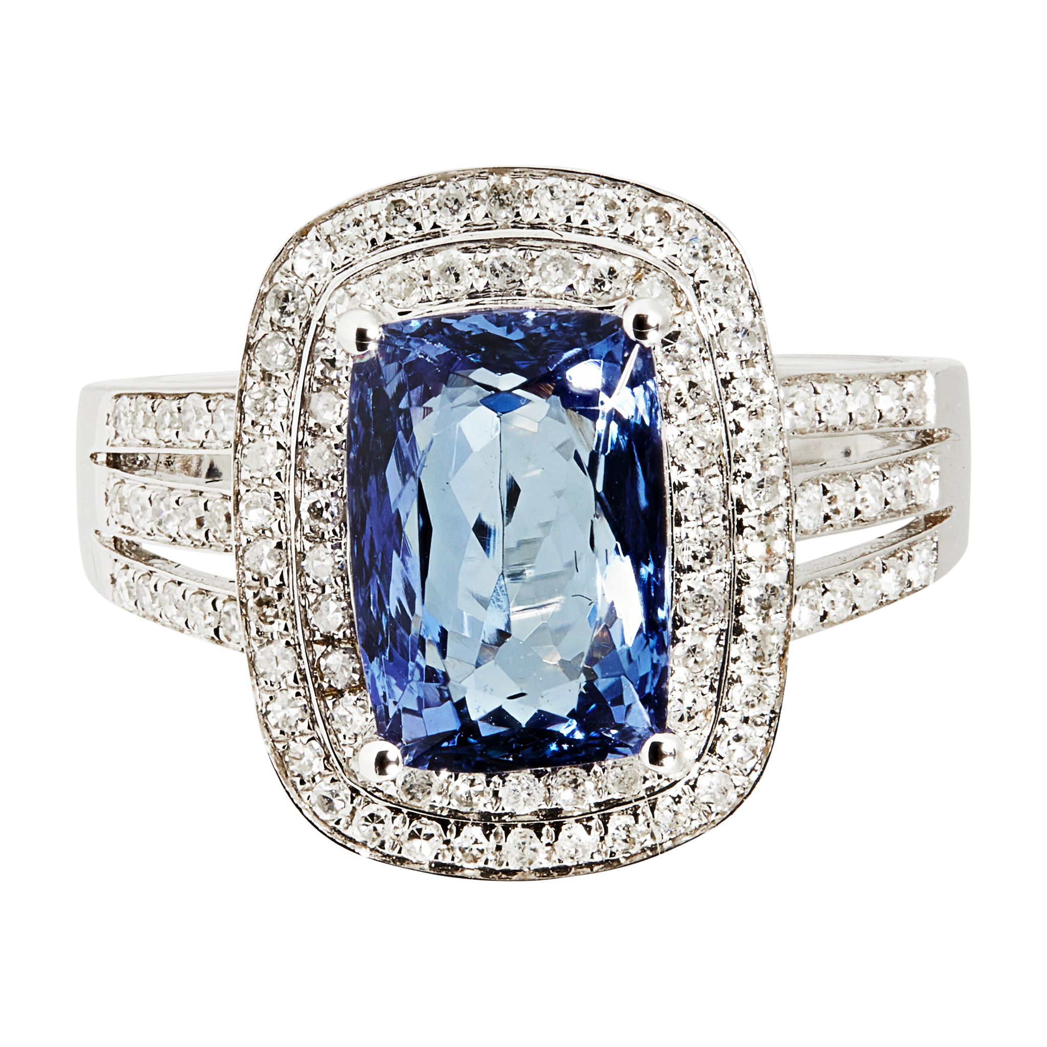 claw set with a rounded rectangular cut Tanzanite, in a double border of small round cut diamonds, the split shoulders similarly set, to a plain white metal shank stamped 14k
