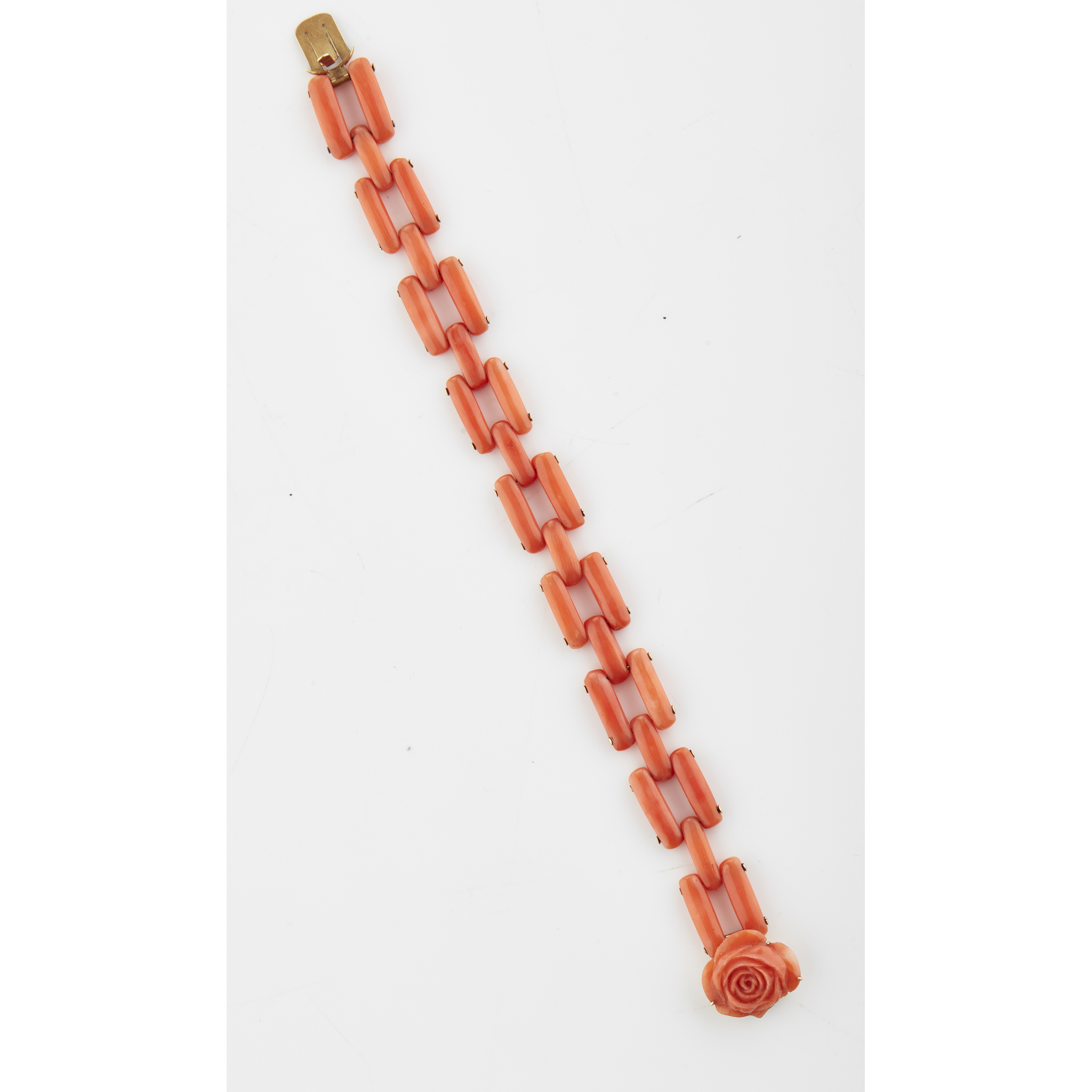 composed of polished rectangular coral links, the clasp with applied carved coral flower