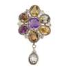claw set with a central rectangular cut amethyst, in a border of oval collet set Cairngorms and a amethyst, with fluer-di-lys detail, suspending a single gem set drop