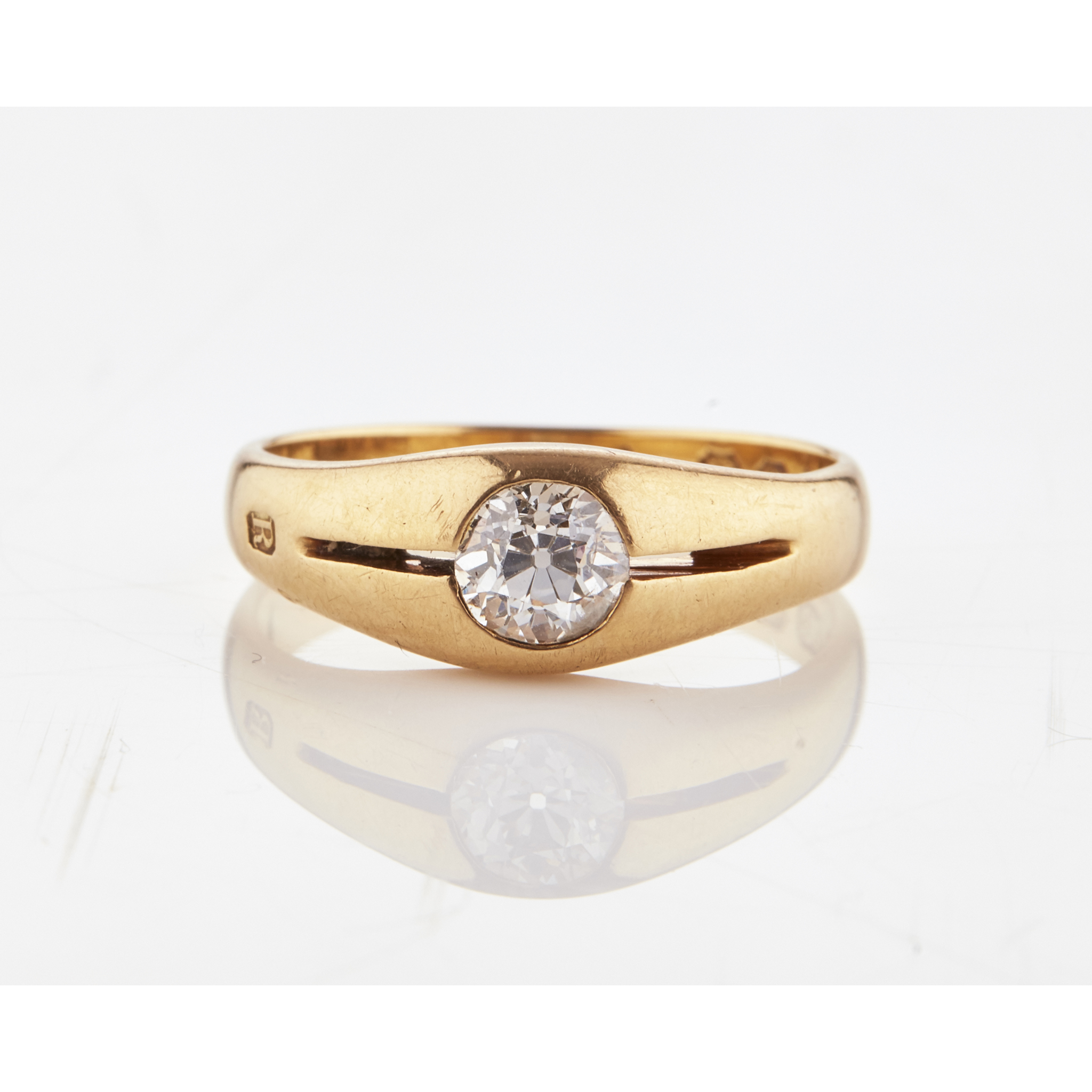 gypsy set with an old round cut diamond, with pierced detail to shoulders, to a plain shank